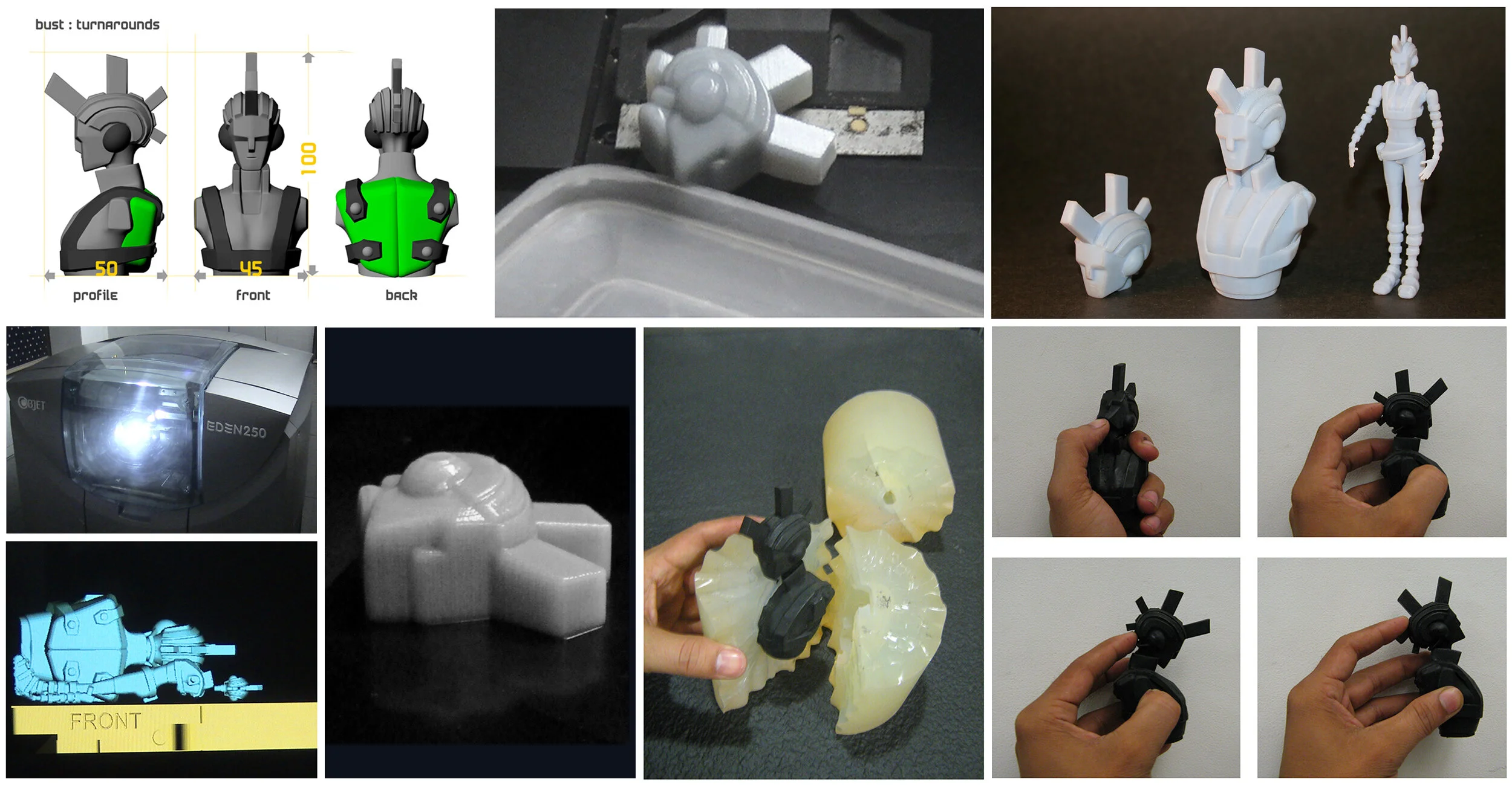 (From top left to right) The 3D model of the character (Xia) being exported to 3D printer in three different formats (head, bust and figure). The 3D printed model being scooped from the printer bed. The bust model being used to create a silicon mould. One of the casts used for the mould was a flexible PVC that allowed minimal bending (as shown)..